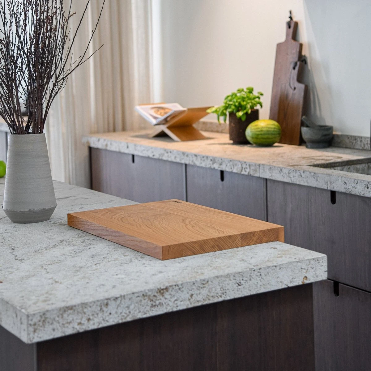 Een praktische en stijlvolle toevoeging aan uw keuken. Een eiken snijblok van massief eiken met een handige anti-slip rand. Deze zijrand zorgt ervoor dat uw aanrechtplank recht blijft liggen tijdens het snijden. Een natuurlijke eyecatcher door de unieke houtstructuur, maar ook de ideale culinaire tool voor iedere foodprofessional of hobbykok.