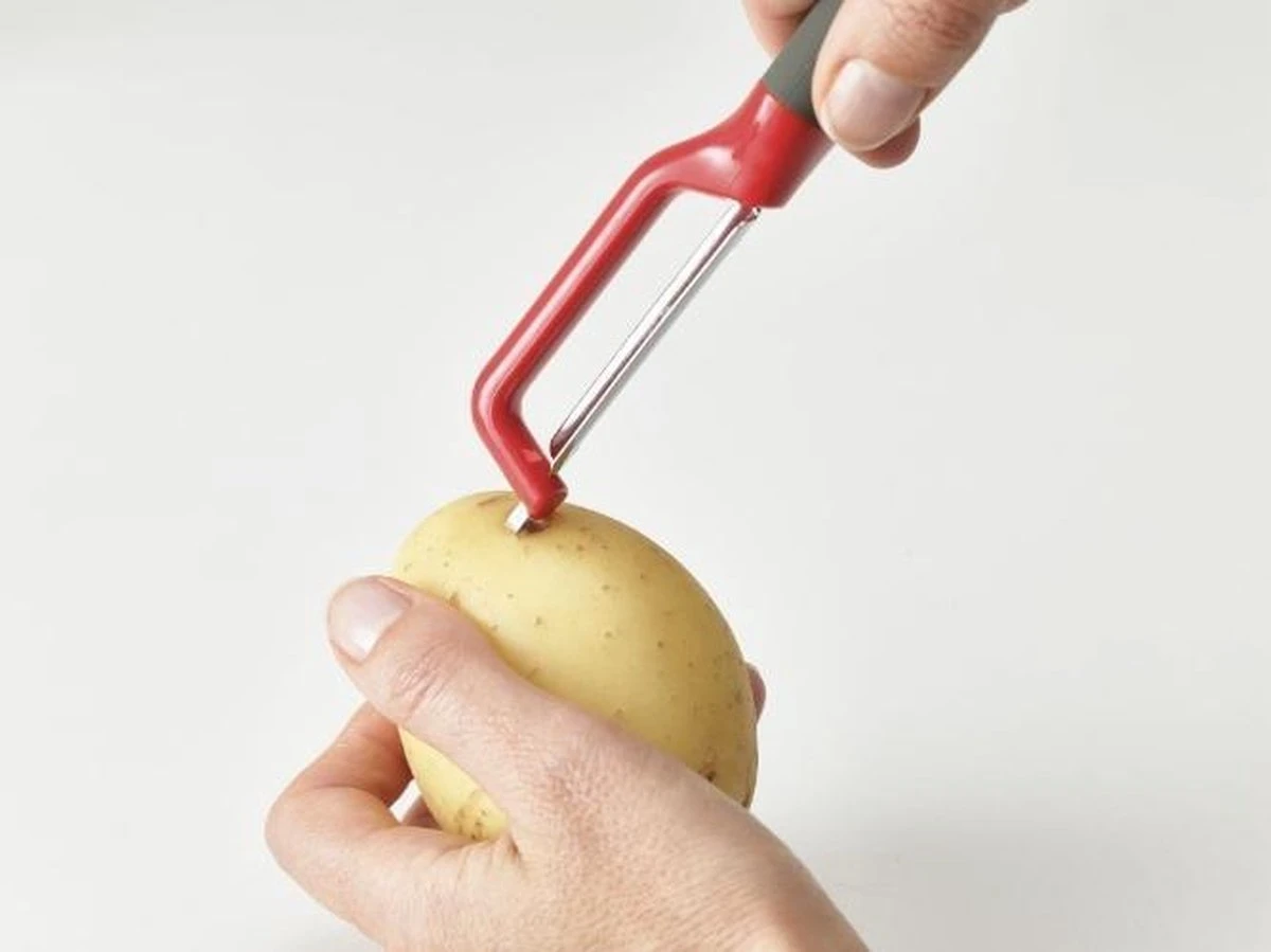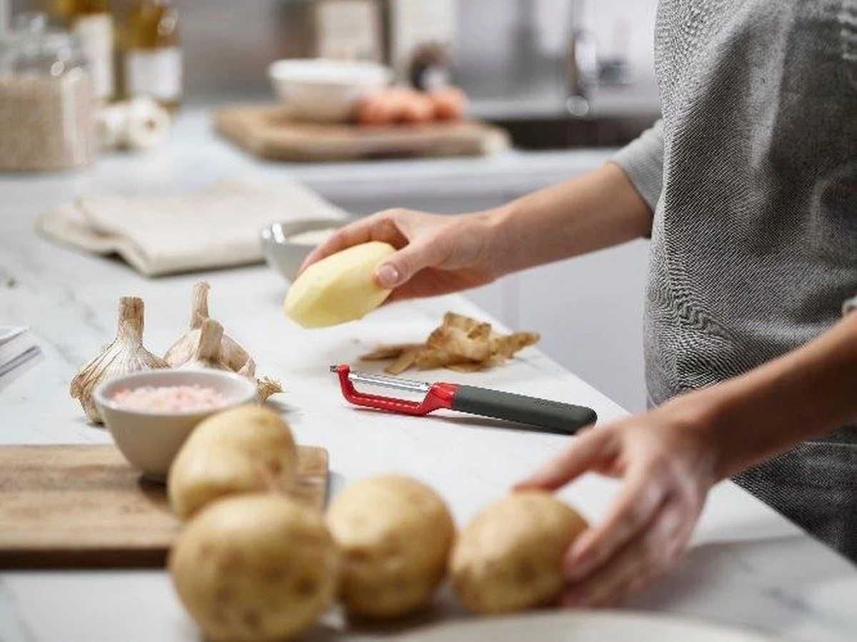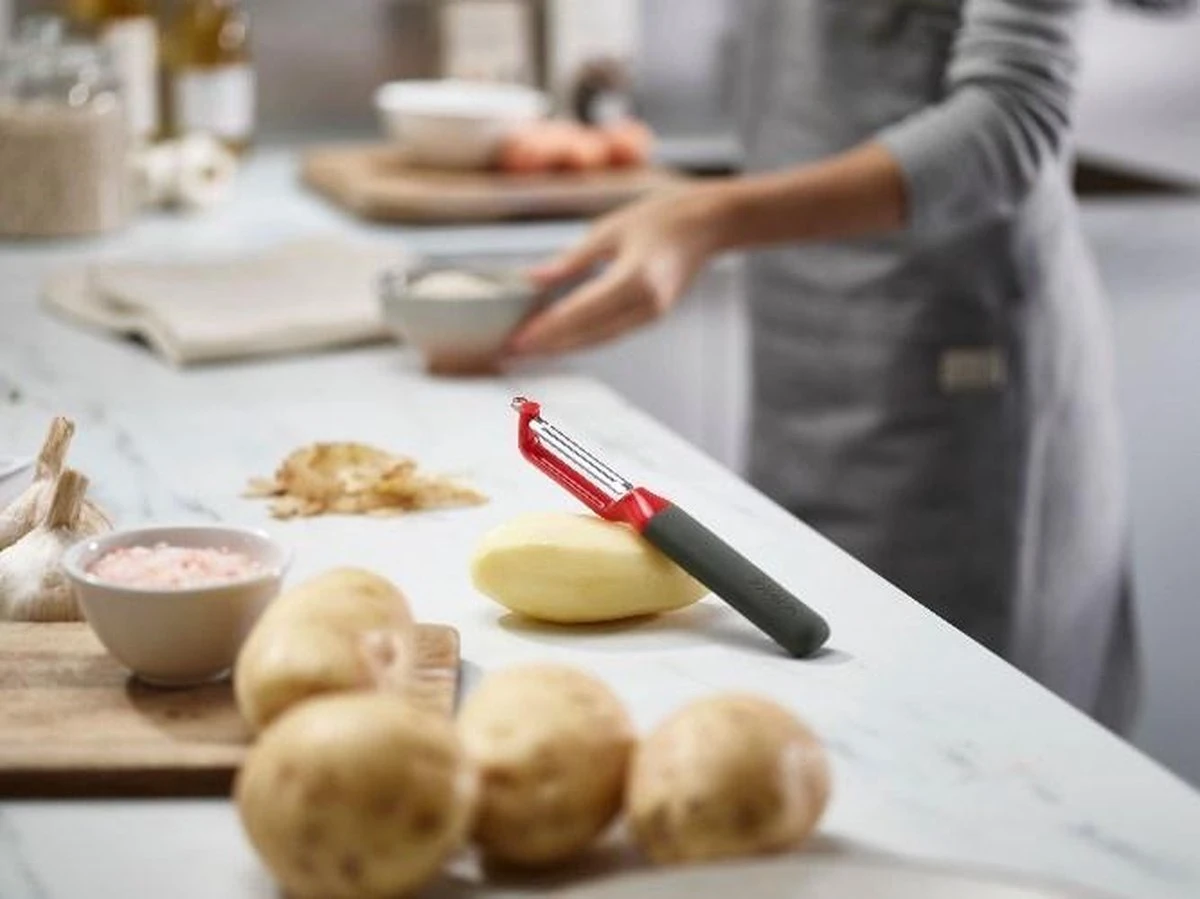 Deze snelle, slanke dunschiller van Joseph Joseph heeft een stevige, gemakkelijke handgreep en een scherp RVS mes. Het mes is draaibaar om altijd contact te houden met het stuk groente voor extra gebruiksgemak en snelheid. De handige tool aan de bovenkant is perfect om de ogen van aardappelen te verwijderen. Na gebruik kan de dunschiller worden schoongemaakt in de vaatwasser al is handwas aan te raden voor een langere levensduur.